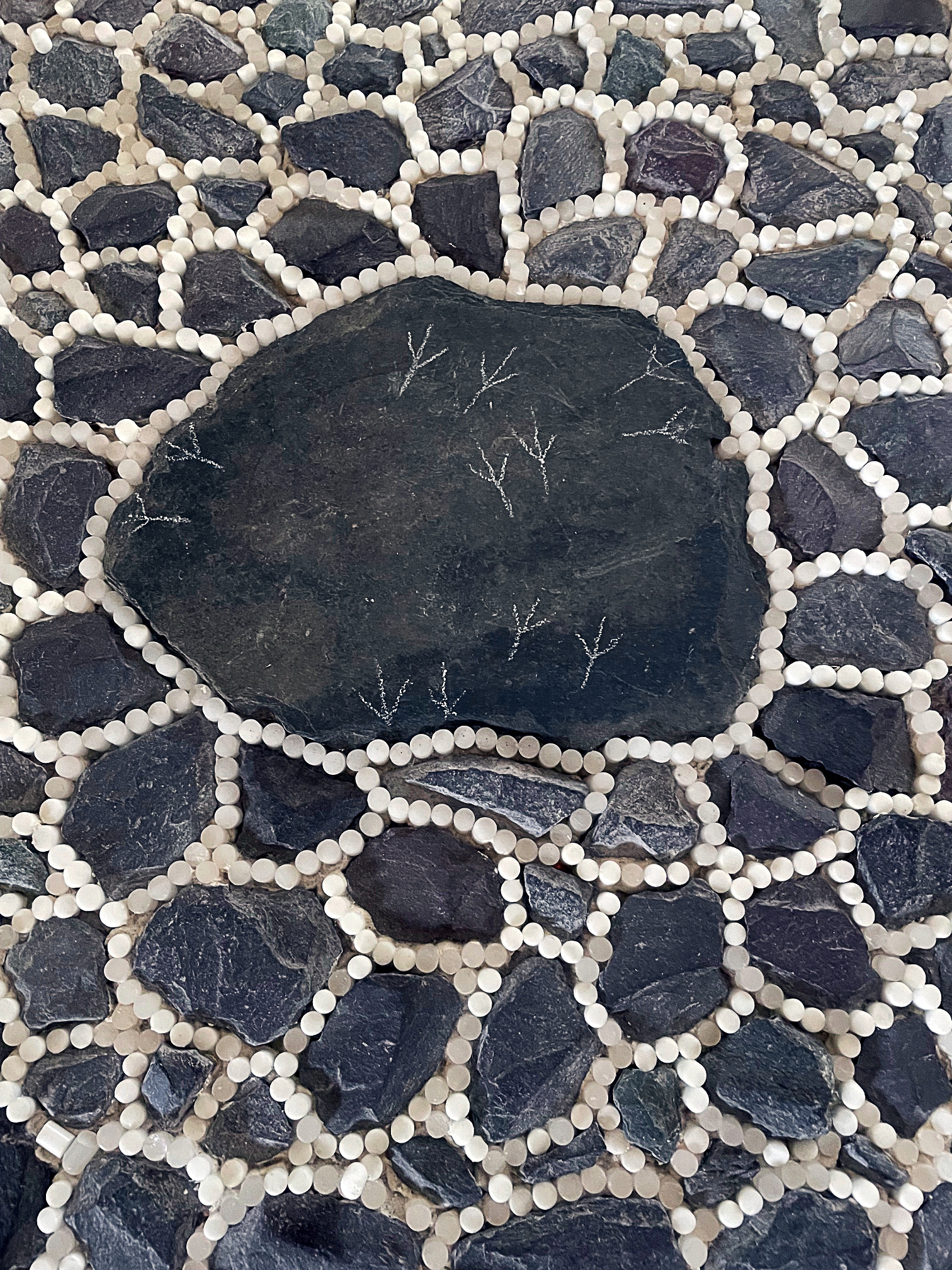 Eichenstuhl gekalkt, Mosaikauflage auf Holz bestehend aus Schiefer und Glasstäben (Murano) mit Kreidezeichnung